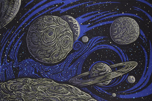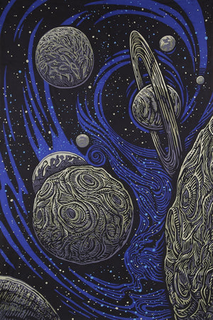 Tapiz 3D del espacio exterior galáctico que brilla en la oscuridad. Recargable con bombillas incandescentes.