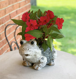 Mini stone frog planter made of a stone-look composite. Intricate details and