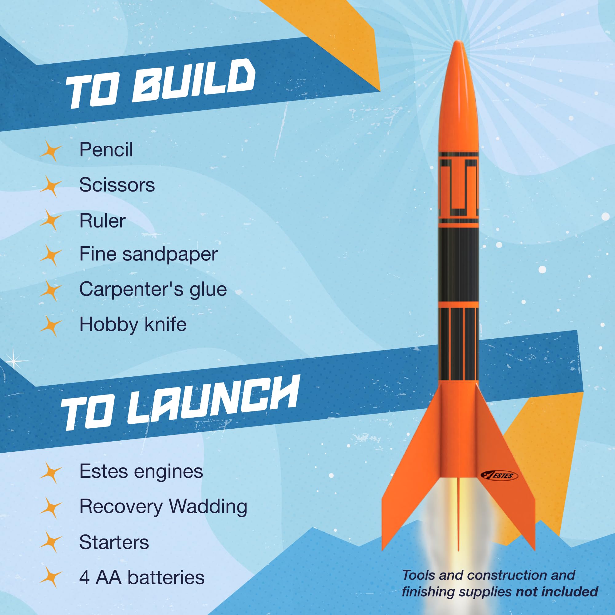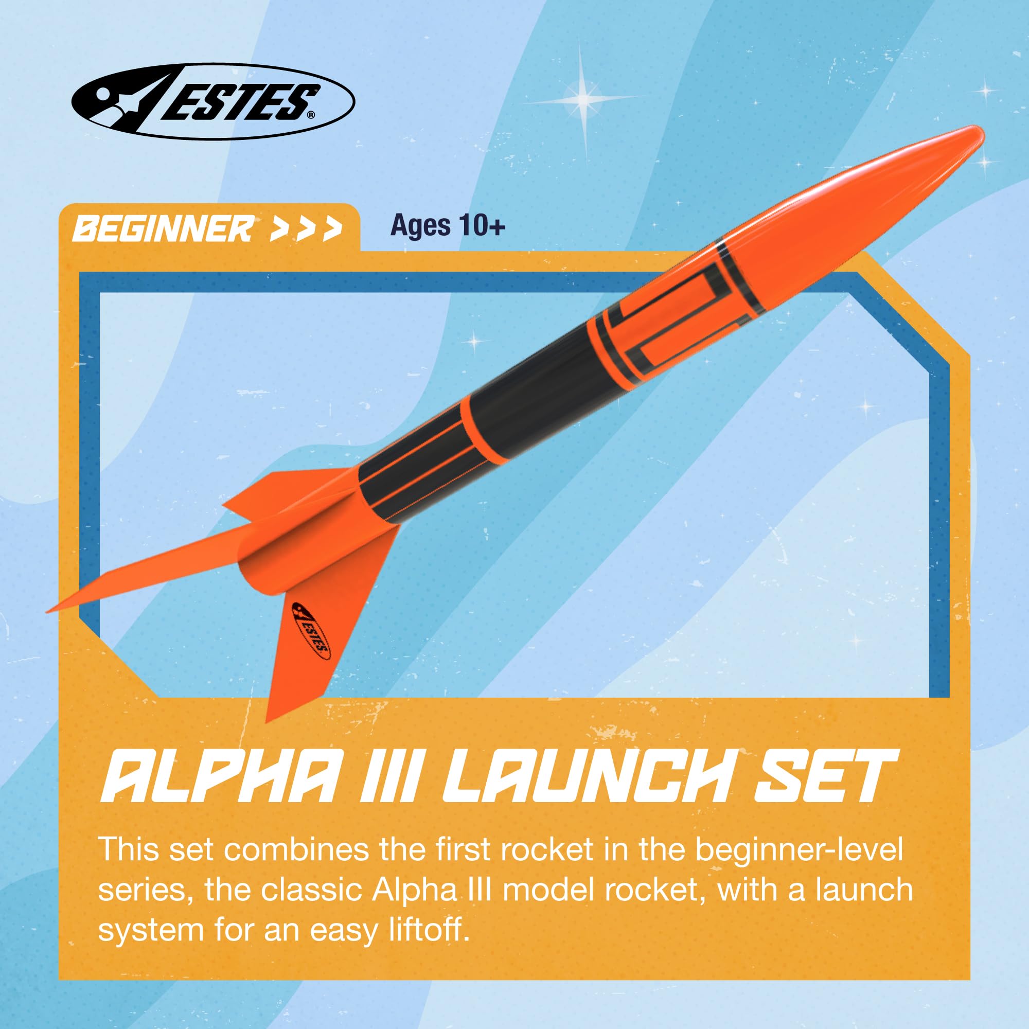 - BEGINNER MODEL ROCKET LAUNCH SET: The Estes Alpha III launch set lets kids ages 10+ and hobbyists easily build and launch this iconic model rocket. The model rocket kit includes rocket parts, engine mount, decals, a parachute, a launch pad system, and instructions. For blastoff, youll need Estes rocket engines, Starters, Recovery Wadding, and 4 high-quality 1.5-volt AA alkaline batteries (not included).