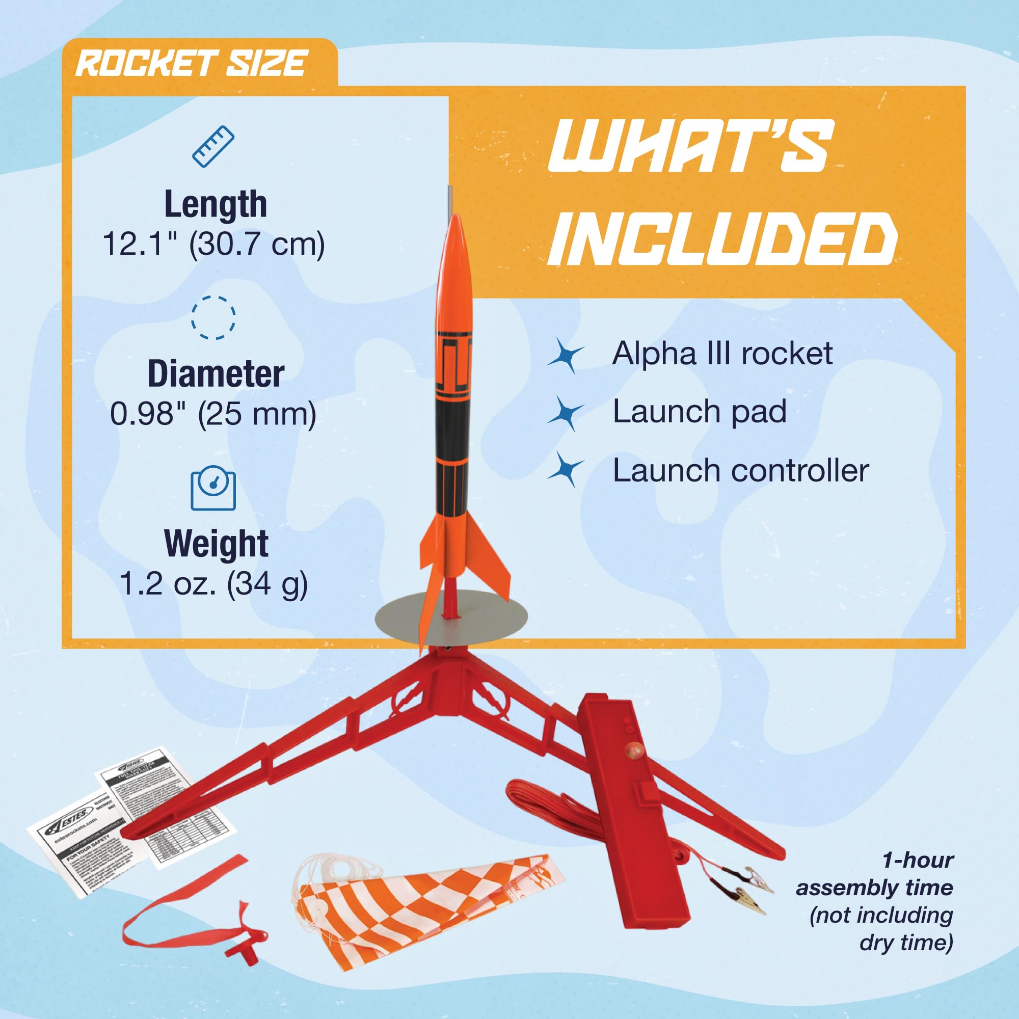 - READY TO ASSEMBLE: Rocket building sparks creativity and a love for science and outer space! This beginner Alpha III model kit is easily put together with 1 hour of preparation and includes decals. It comes with a Porta-Pad II Launch Pad and Electron Beam Launch Controller for an unforgettable blastoff for first-time rocketeers.