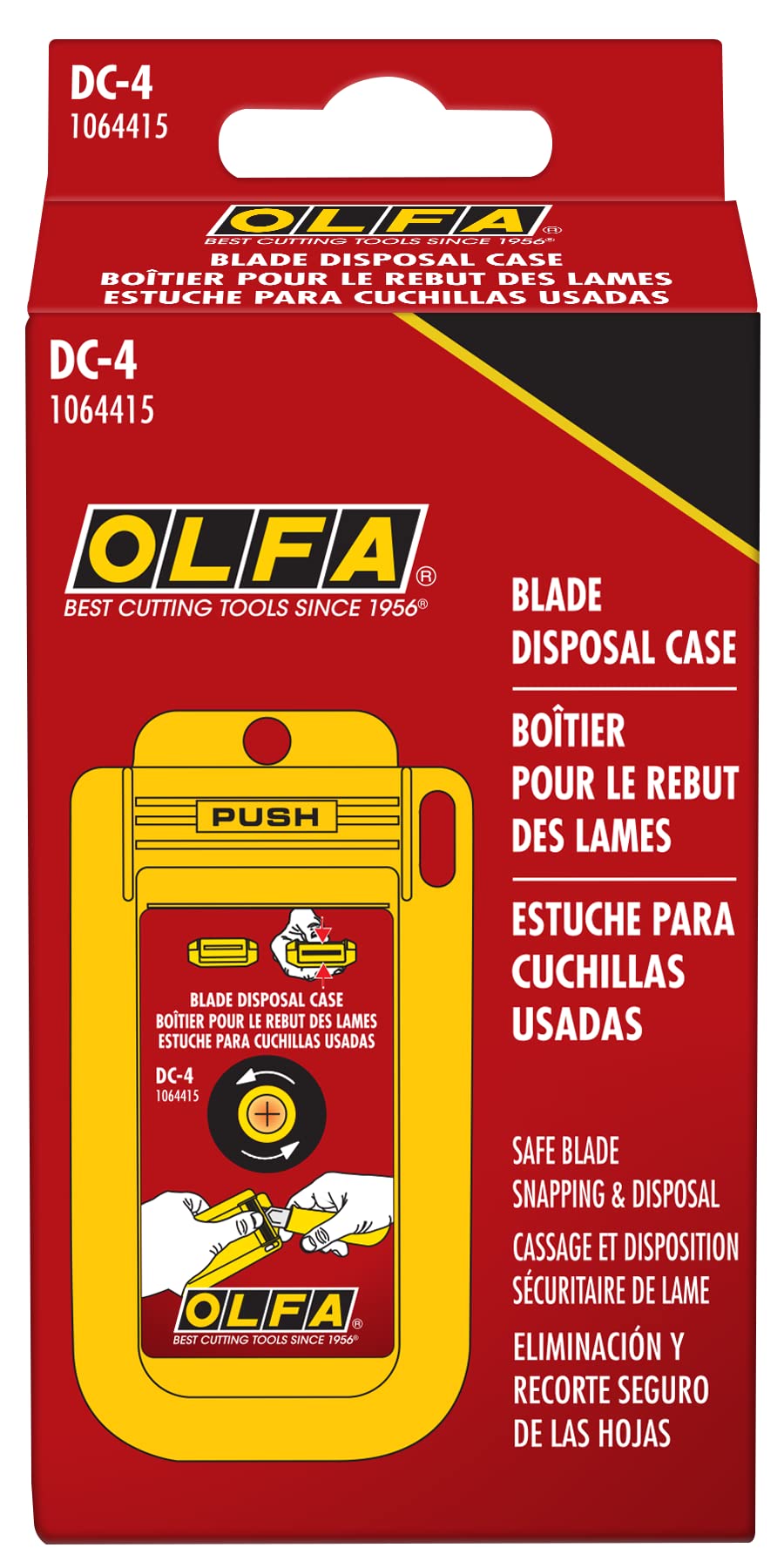 Use the OLFA DC-4 Reusable Blade Disposal Can with Mounting Hole to dispose of blades with quick ease. This handy disposal system can snap 9mm precision blades or 18mm utility blades. The canister traps the used segments for safe disposal. The screw safe system prevents used blades from falling out. The press-and-release operation makes sure the container is only open when in use. Use the mounting hole for easy storage or keep one in your toolbox.