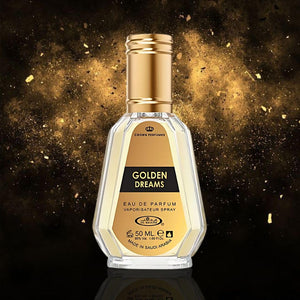 Al-Rehab Golden Dreams Eau de Parfum Spray 1.69 fl oz (50 ml) is a luxurious floral-fruity unisex fragrance that weaves bright, elegant blossoms with juicy fruity undertones over a soft patchouli-herbal base, creating a warm, sophisticated and long-lasting scent suitable for both day and night.