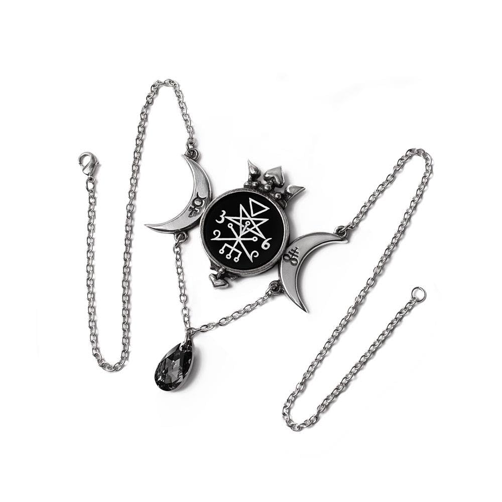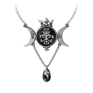 Embrace the awe of divine femininity and mystical power with our exquisite 'Wycca Queen' crowned triple moon necklace. Inlaid with a stunning black onyx disc. Crafted with precision, the necklace is etched with intricate Alchemical sigils and the enigmatic seal of Lilith, connecting you to the depths of ancient wisdom and esoteric beauty. The polished pewter offers a celestial shine, while a mesmerizing grey Austrian crystal shimmers gracefully below, catching the light with every movement!
