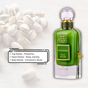 Ard Al Zaafaran Ithra Dubai Pistachio Musk Eau de Parfum Spray for Unisex 100 mL is a creamy nutty sweet fragrance that highlights pistachio in the opening then blends into rose and vanilla before finishing with cinnamon and musk for a warm cozy gourmand feel that is smooth long lasting and ideal for cooler weather nights or whenever you want a comforting dessert like scent