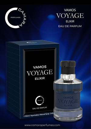 Camara Vamos Voyage Elixir Eau de Parfum for Men 100 mL is a bold fresh spicy fragrance that opens with bright citrus and warm spices then smooths into aromatic lavender and finishes with a rich masculine base of amber sandalwood patchouli vetiver and a sweet licorice touch making it a confident long lasting day to night scent