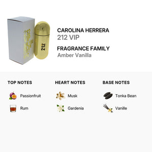 212 VIP by Carolina Herrera is a fruity Eau de Parfum for women designed for everyday glamour. Rum and passion fruit open the scent, followed by a gardenia heart, while vanilla, musk, and tonka bean provide a warm and intoxicating base that leaves a confident and modern impression.