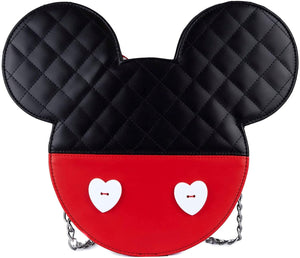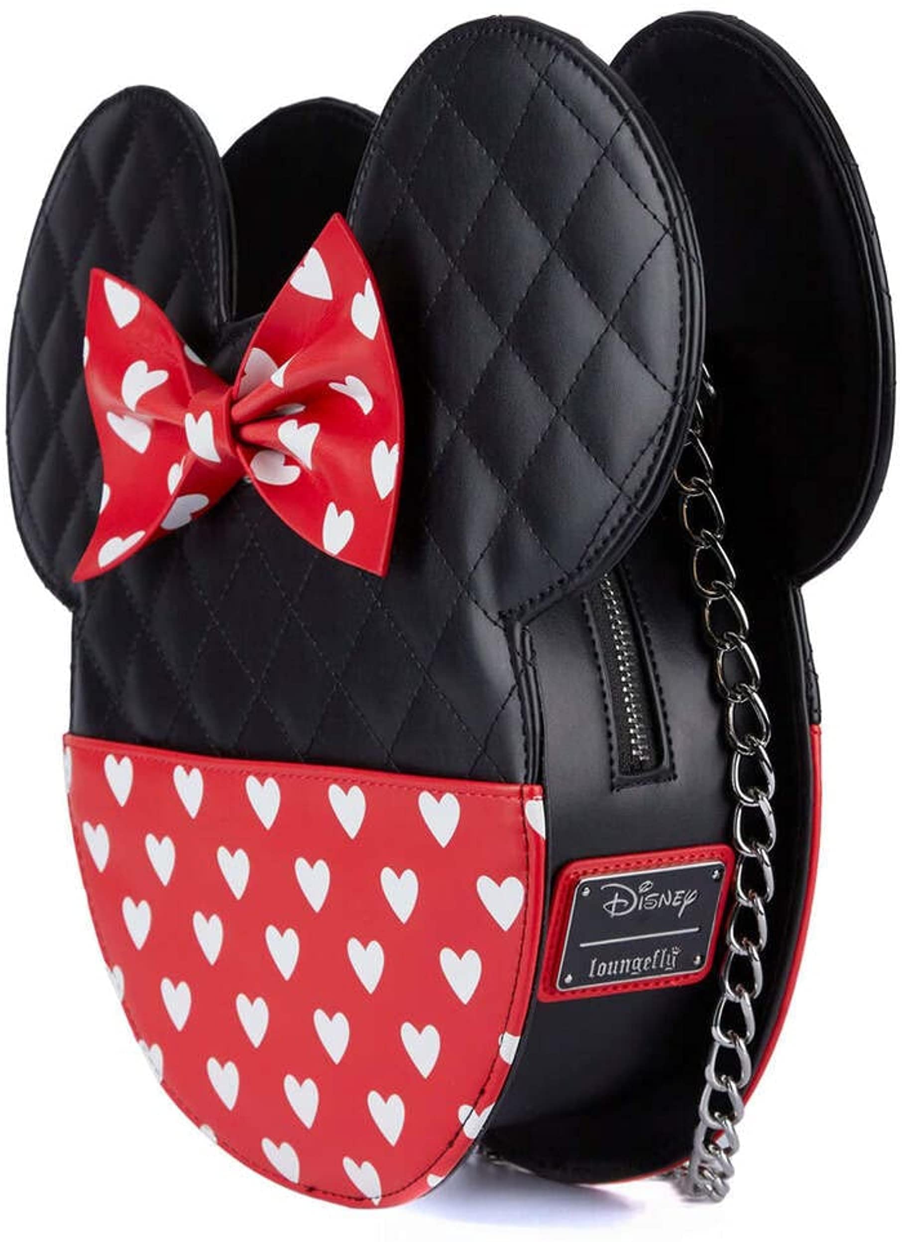 Mickey and Minnie crossbody bag from Loungefly Faux leather exterior Reversible Valentines design Applique, quilted, button and printed details Measures 13"Lx3"Dx11.25"H