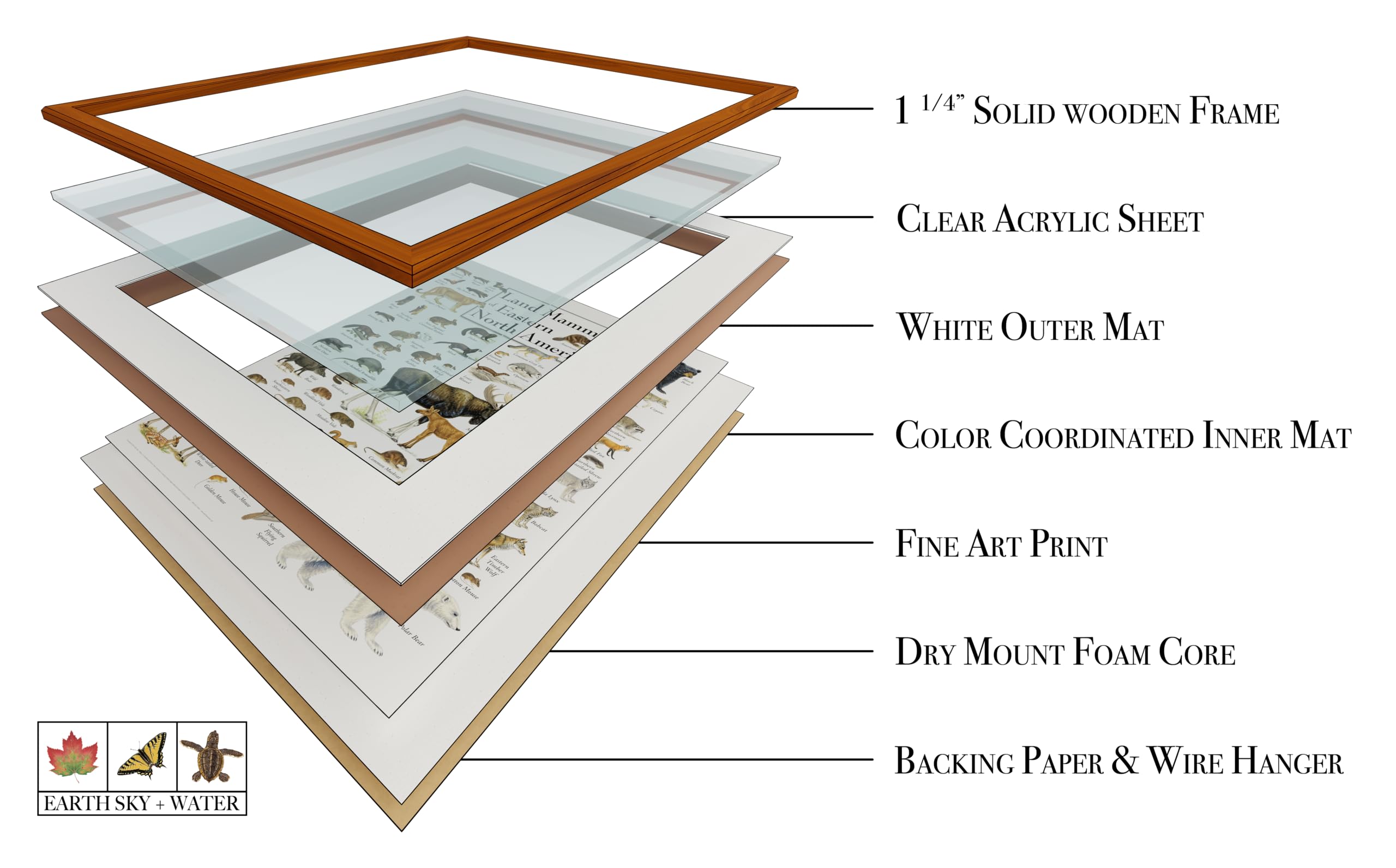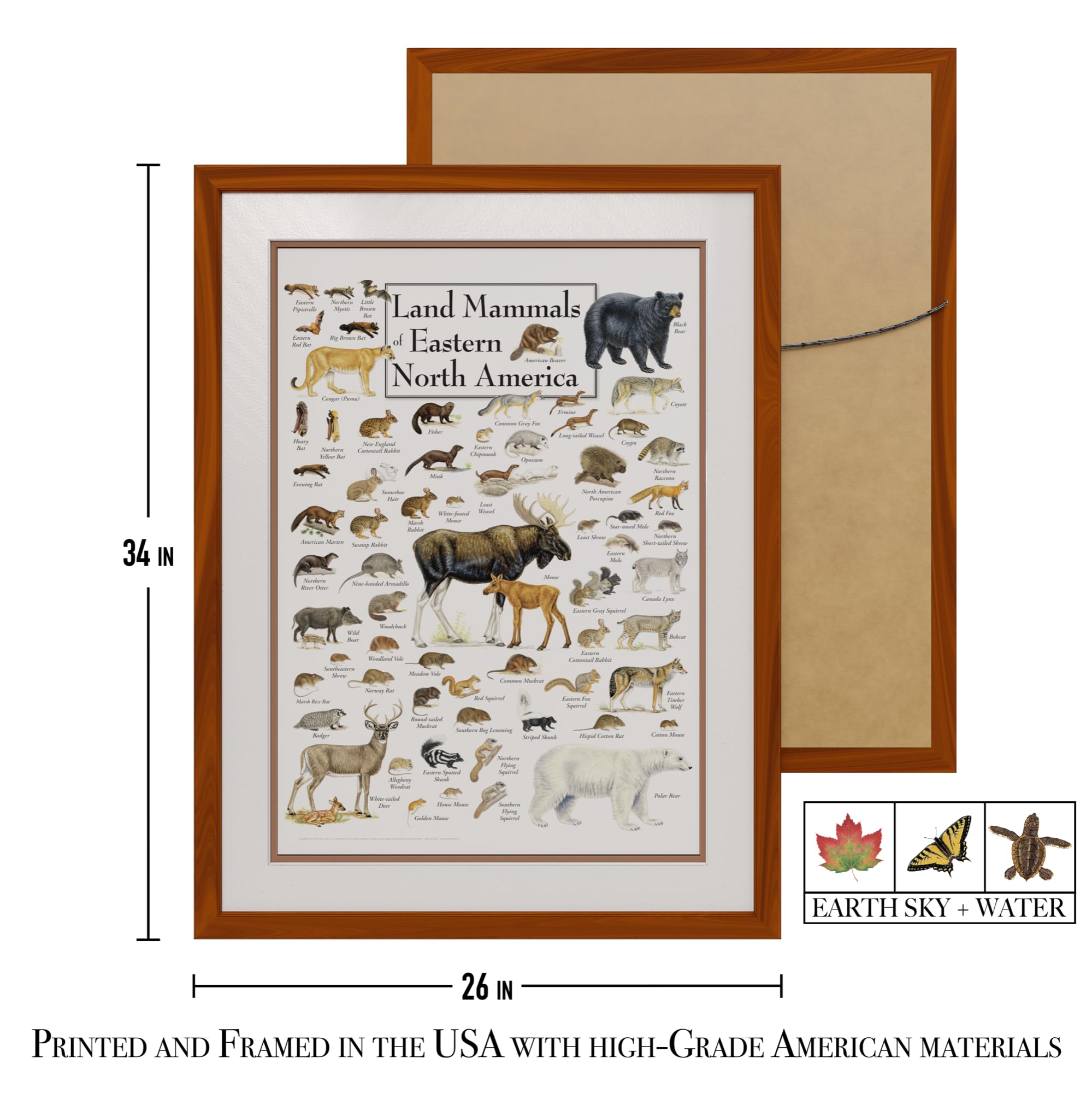 Earth Sky + Water - Land Mammals of Eastern North America - Double-matted Posters with Honey Frame