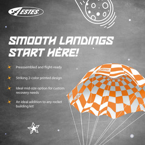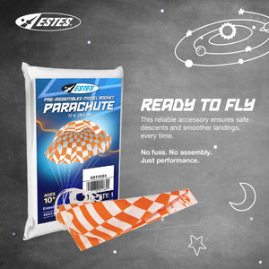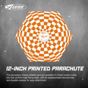 The Estes 12-Inch Printed Parachute is a must-have recovery accessory for any model-rocket enthusiast or STEM classroom. Designed for both beginner and advanced rocketeers, this durable and lightweight parachute ensures your rocket lands safely after every flight, allowing for multiple relaunches and continued experimentation. With its printed pattern and bright color scheme for enhanced visibility, its easy to spot during descent and retrieval. This parachute features preassembled shroud lines and a sturdy plastic canopy for quick attachment to your rocket nose-cone anchor. Compatible with a wide range of Estes model-rocket kits, it supports flights up to standard and mid-power engine levels. It reduces impact on landing to help preserve the rocket body and fins, extending your rockets life and supporting long-term STEM learning. Always follow the NAR (National Association of Rocketry) model-rocket safety code during rocket kit operations. Estes rocket kits are built from the highest-quality components and designed around the unforgettable experience of pressing launch. Our hobby and STEM educational science products range across all skill levels, interests, and power levels. Unleash the space dreamer and science enthusiast in you with an Estes model rocket! From the Manufacturer Estes 12 inches Parachute.