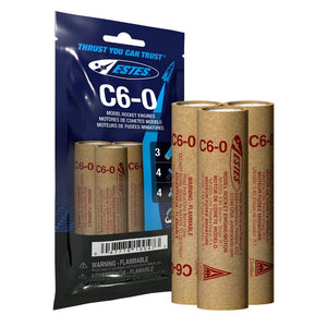 The Estes C6-0 standard (18 mm) engine is a booster stage type of engine (red label) that is used in combination with an upper stage engine for flying a two stage model rocket. This engine is designed for flights in rockets weighing less than 4 ounces, including the engines. Each engine size is designated by a letter and is up to twice as powerful as the letter before it.