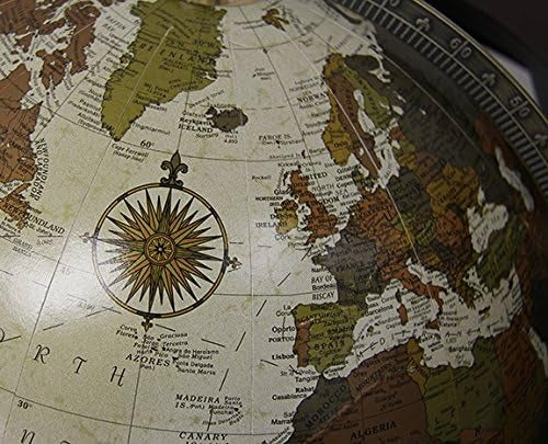 Experience the elegant charm of the American made Replogle Lancaster Floor Globe. The endless appeal of the exquisitely designed model is immediately apparent. An object that is sure to inspire hours of endless curiosity and admiration, the handsome radiance of this 12 inch world globe bursts forth when poised on its 35 inch tall dark cherry-finish wood stand. Its three straight legs, with their curved accents, sturdily support a horizontal 360 degree hardwood ring, which encircles the globe. The full metal die-cast meridian is gimbal mounted the frame, meaning that the sphere can be swiveled up and down for closer inspection. The pale, parchment colored ocean of this antique political map are accented by the bronze-metallic toned landmasses. The countries fit together on their respective continent's like metallic puzzle pieces, adding to the rich color scheme of the Replogle globe. Up to date place names and cartographical information is presented on this world globe in a classic map styling, featuring antique flourishes. The stately charisma of the Replogle Lancaster Floor Globe makes it an easy fit into the home, office or school.