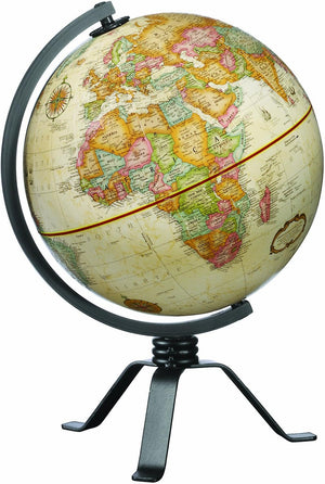 The boldly contemporary base of the Replogle Mackie Desktop Globe stands in striking contrast to the antique styled map. However, it is the very juxtaposition of these two styles that gives this world globe its unique and original appeal. The 9 inch Replogle globe stands 13.5 inches tall with the base included. This model features three rubber-footed legs supporting a triple-ringed riser. Above that is an arched bar that serves as the world globe's semi-meridian. The painted black metal stand holds the sphere at a 23.5 degree tilt, just like Earth. The decidedly modern flair of the base holds up against the nostalgically inspired globe. Featuring Replogle's "Classic Series" map, the beige colored oceans are complimented by the multicolored patchwork of the landmasses' political divisions. The world globe contains a myriad of classical map characteristics like compass roses, cartouches and ornamented legends. The Replogle Mackie Desktop Globe is small but fierce. A reasonably sized addition to your desktop, tabletop, bookshelf or coffee table, this beautiful model is sure to mesmerize and impress passers-by