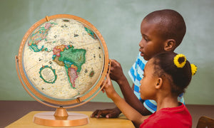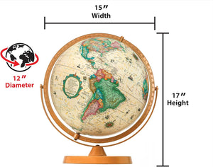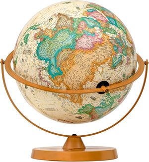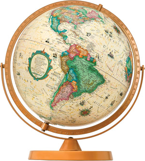 The Replogle Pioneer Desktop Globe is a classic globe in the manufacturer's esteemed "education globe collection." Perfect for igniting a passion for geography in young minds, this educational tool thrives in a home or school environment. Swivel the 12 inch globe up and down on its 17 inch high stand. Sitting atop its brown metal base, a gimbal-mounted full metal meridian holds the sphere and features latitudinal markings stamped on its frame. The blue ocean hue is set against the vibrant pastel shades of the landmasses and their respective countries. Thousands of place names populate this political map's surface. Water currents, a grid designating longitude and latitude, and other cartographical information are clearly presented on this easy to read map. The world globe's coherent presentation and detailed geography make it a captivating model. The sturdy, dependable and time tested Replogle Pioneer Desktop Globe is an effective learning tool. Meant to inspire a love for geography, this trailblazing world globe will never go out of style. Aptly named, the Pioneer is an original that paved the way for many desktop globes after it.