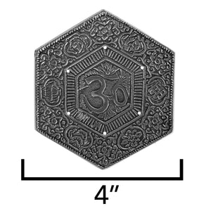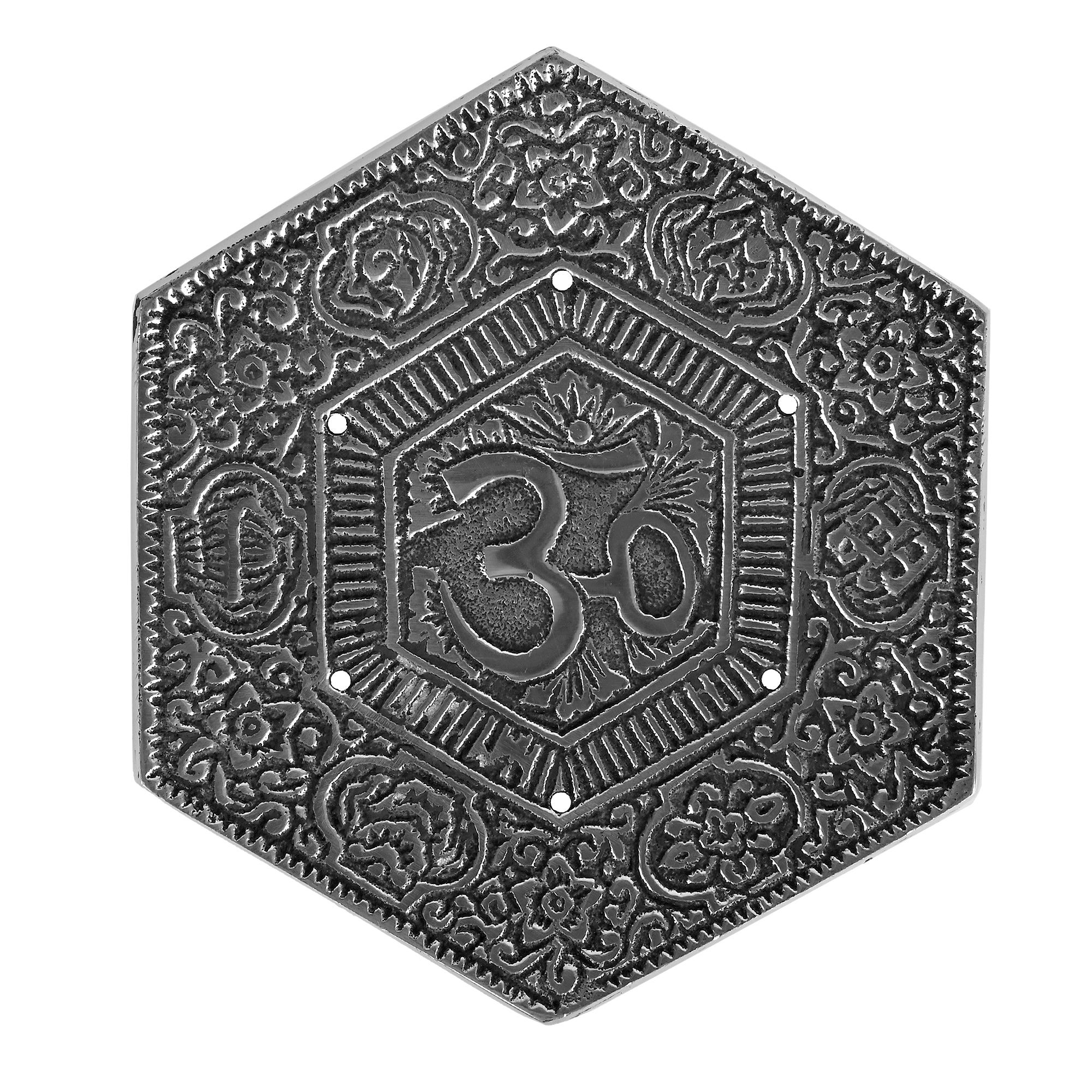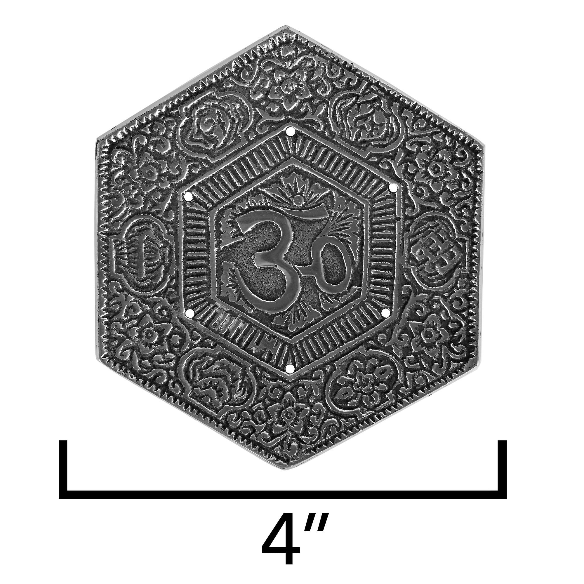 - 2" OM symbol in the middle and is also decorate with floral spiral patterns covering its silver-tone base.