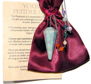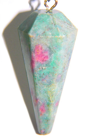 - Beautifully crafted 6-facet Ruby Fuchite pendulum with chakra beads on a 6" silver chain.
