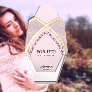 MIRADA Dresscode For Her Eau de Parfum Spray for Women (2.8 fl oz / 100 mL) is a playful yet elegant fruity-floral that opens with a juicy, berry-like sweetness and sparkling freshness, softens into a romantic floral heart, and dries down into a smooth, warm finish with gentle sweetness and a modern musky-woody glow.