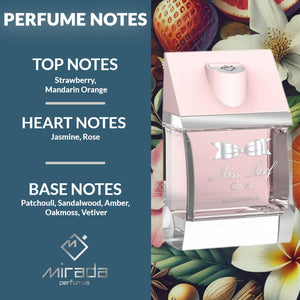 MIRADA Miss Surf Cherie Eau de Parfum Spray for Women (3.4 fl oz / 100 mL) is a joyful fruity-floral that sparkles with strawberry and mandarin in the opening, softens into a romantic bouquet of jasmine and rose at the heart, and settles into a warm, sensual dry-down of patchouli, sandalwood, amber, oakmoss, and vetiver that feels playful yet polished.