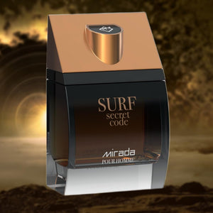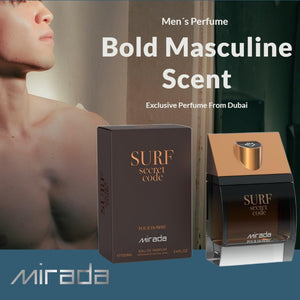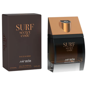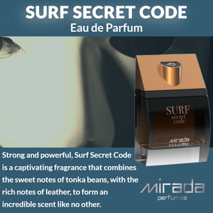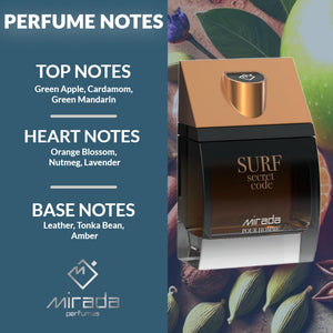 MIRADA Surf Secret Code Eau de Parfum Spray for Men (3.4 fl oz / 100 mL) is a bold, seductive Eau de Parfum that opens with a juicy green-apple freshness accented by bright mandarin and cardamom spice, deepens into a smooth heart of lavender and warm nutmeg with a touch of orange blossom elegance, and dries down to a powerful base of leather, tonka bean, and amber for a confident, night-ready finish.