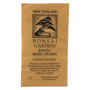 Kyoto Moss Spores Our Moss Spores are of a variety commonly termed 'Kyoto' Moss, as is prevalent at the Kyoto Gardens in Japan. The beautiful, bright green velvet appearance is weed free, since it is greenhouse-grown in sterilized soil. Shelf life is indefinite, as spores are packed in a zip-lock bag within the envelope. A detailed growing guide is included. 1/2 Ounce Net Wt. Covers up to 3 square feet.