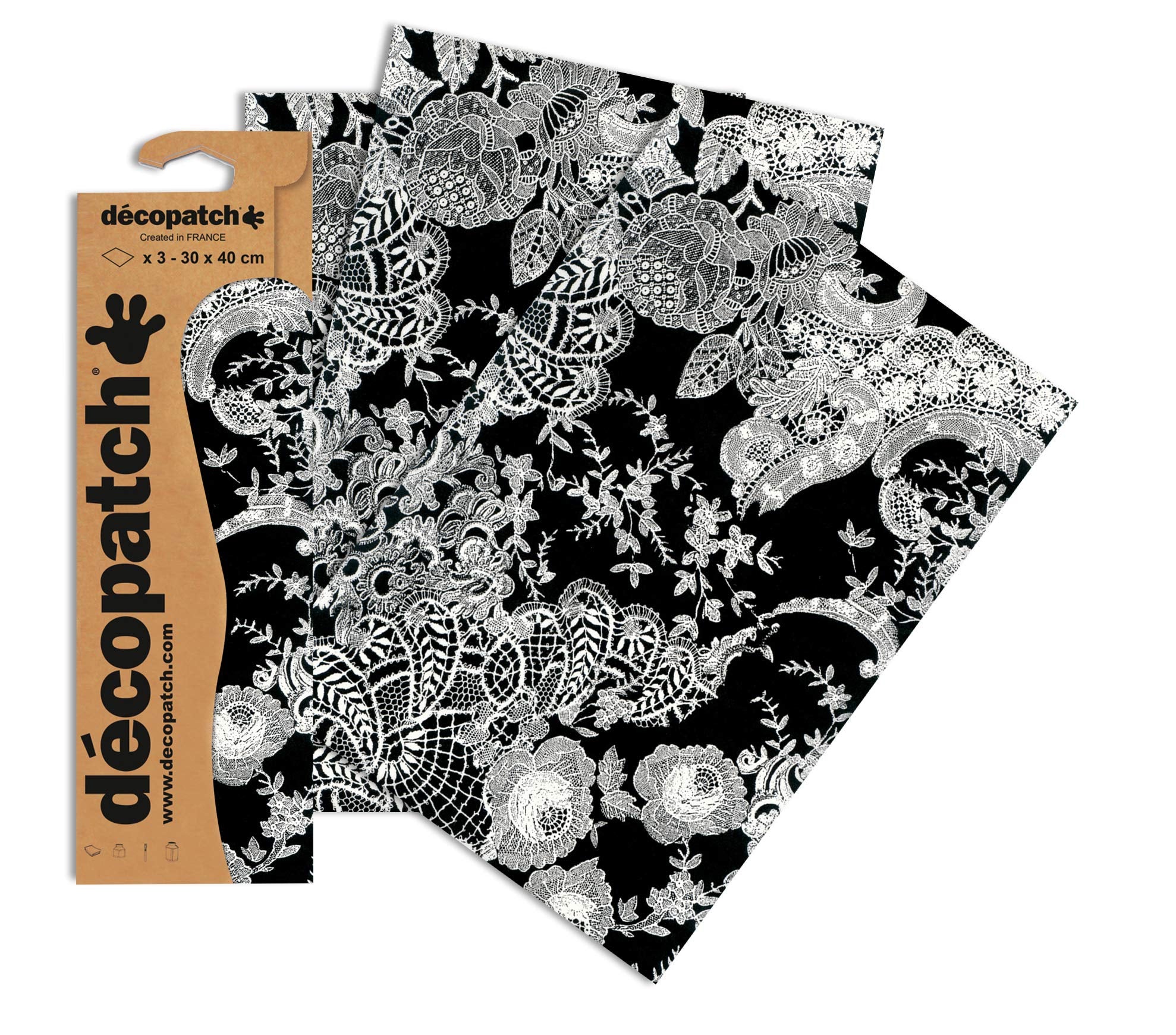 Decopatch Papers - Pack of 3 sheets - 11 3/4 x 15 3/4 - Black w/ White Lace