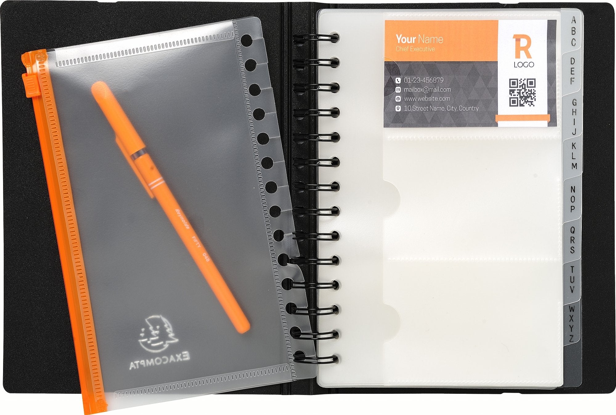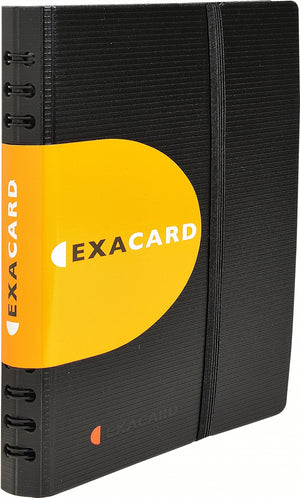 Exacard is a refillable, wirebound business card holder wth versatility, as it's ideal for coupons, recipes, and receipts as well! It comes with 20 removable clear sheets (3 slots each), alphabetized dividers, and a pocket for storing and protecting small items or a few extra cards. The polypro cover is made from recycled materials.