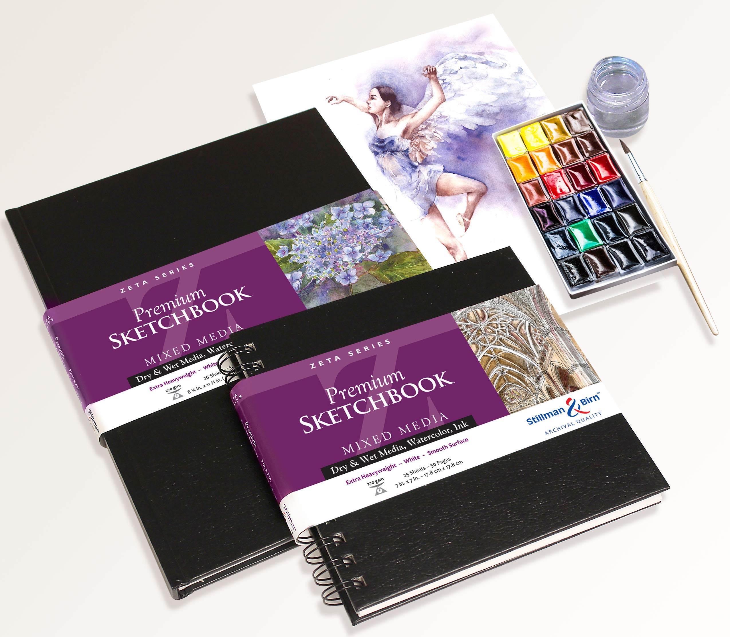 Stillman & Birn Zeta Series Hardbound Sketchbooks, 270 gsm (Extra Heavyweight), white paper, smooth surface. Suitable for dry and wet media, watercolor and ink. Example of recommended usage: detailed pen & ink line work combined with liberal applications of watercolor. A favorite of botanical artists and illustrators. Acid-free, chloride-free, lignin-free.