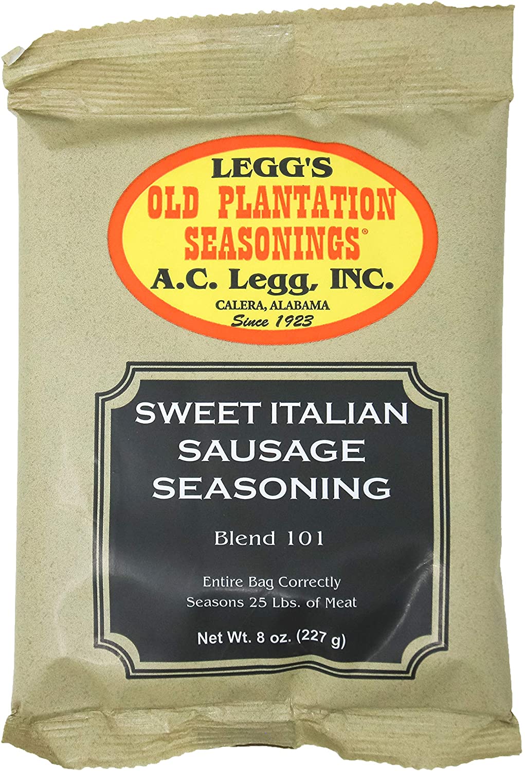 A full-flavored sugary Italian sausage. A good combination of Fennel and Sugar to make that slightly sweet flavored Italian Sausage. You can use 25 lbs. of lean pork (boneless pork shoulder butts will work if you can't purchase 80/20 pork trim from a butcher shop). Or you can use 22 lbs. of lean pork and 3 lbs. of lean beef. Empty entire bag of seasoning into the 25 lbs. of meat and mix thoroughly (it works best if you cut the meat into small chunks first). Then stuff the sausage into natural hog casings for links. Or you can package the sausage in 1 lb. bulk freezer bags.