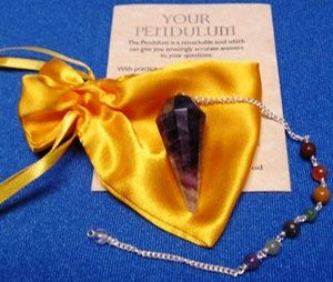 Product Code: DPCA Beautifully crafted Amethyst Chakra Pendulum with chakra beads on a 6À silver chain ( total length 8À). Amethyst is the gemstone for Channeling and Intuition. Comes with satin carry pouch and instruction leaflet with oracle chart.