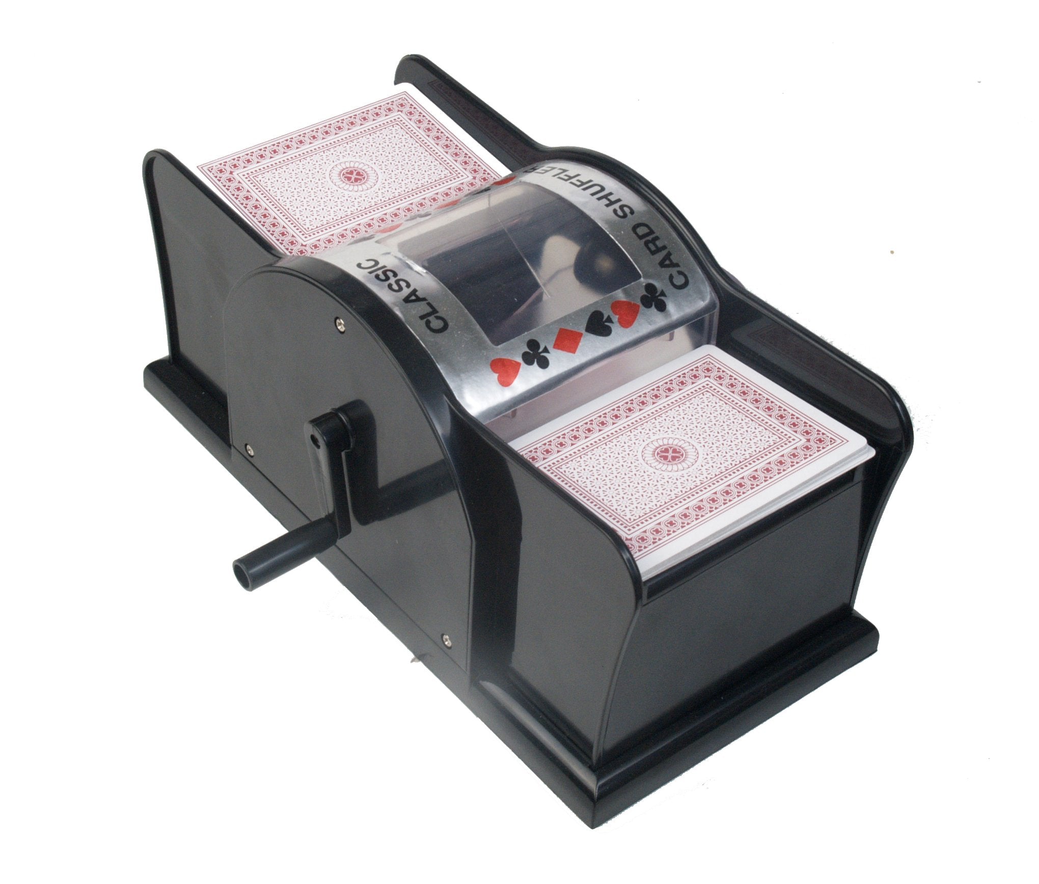 The manual card shuffler set includes 2 decks of cards, shuffles 1 or 2 decks
