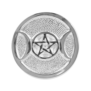 sculpted into the sacred image of the Triple Moon in Silver plated metal.