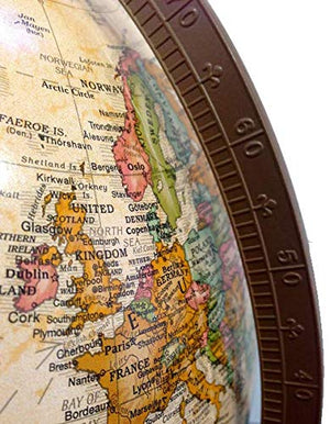 This 16-Inch diameter Antique ocean globe with die-cast meridian rests in an artistically detailed tall hardwood base with a rich walnut-finish.