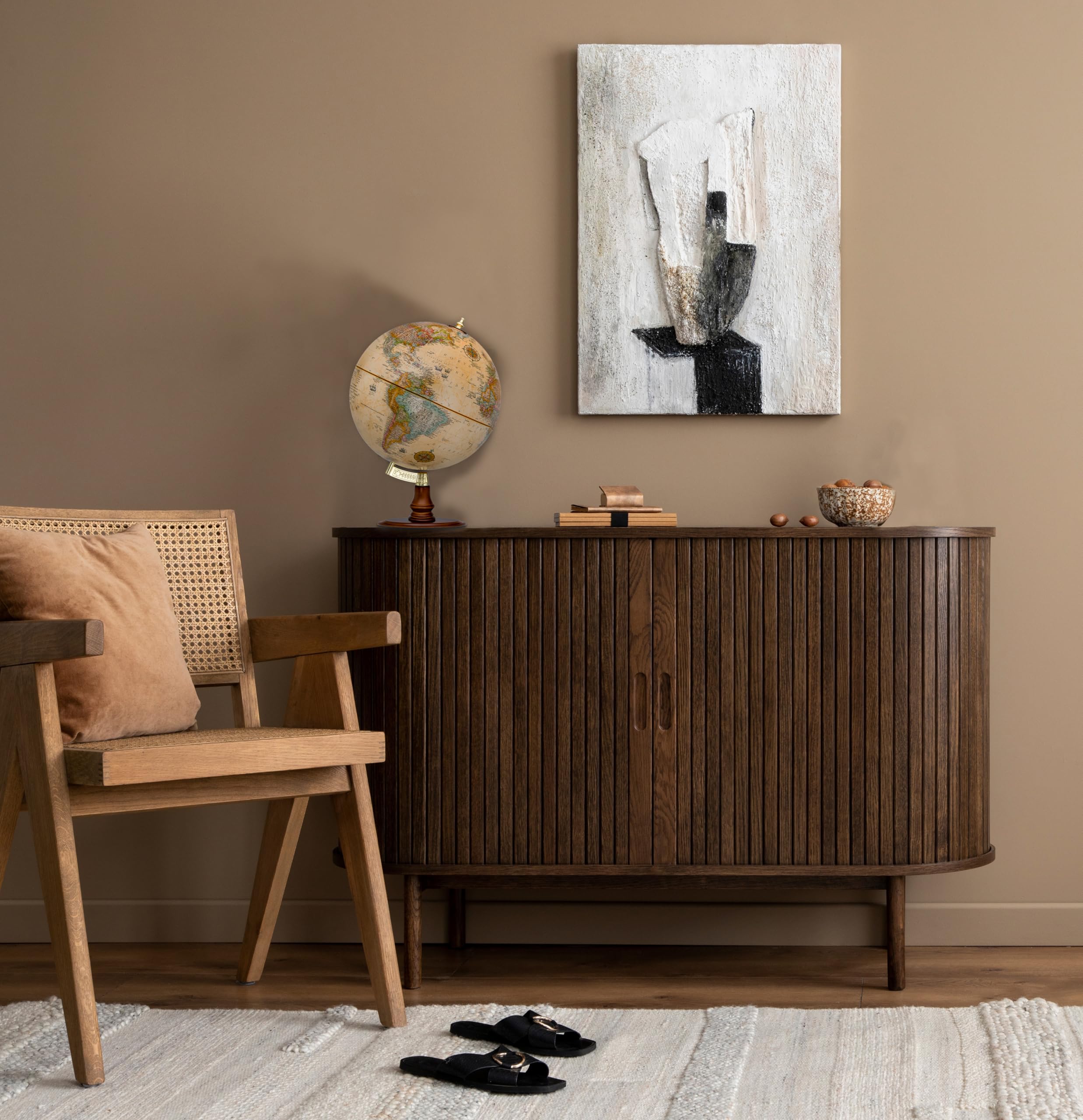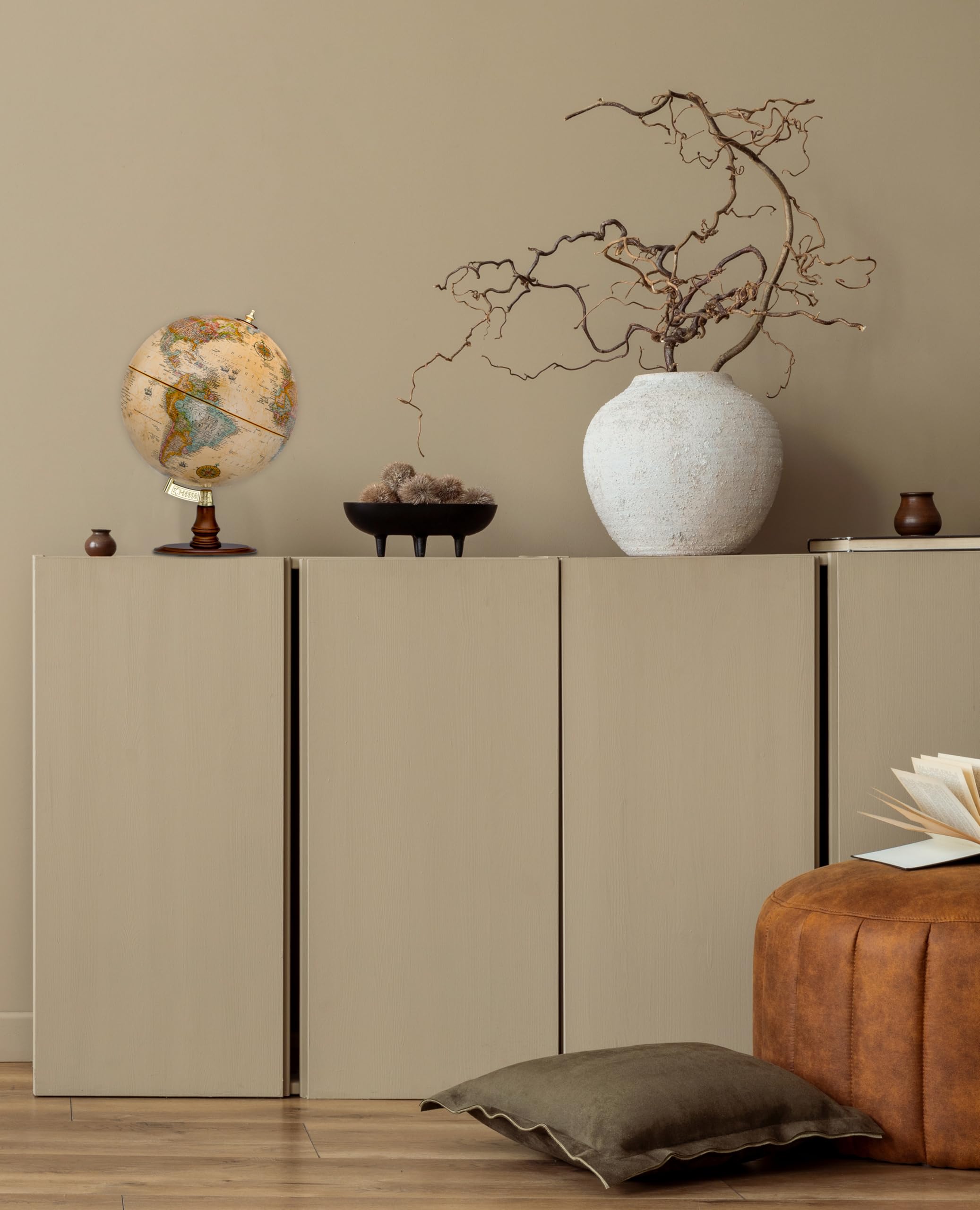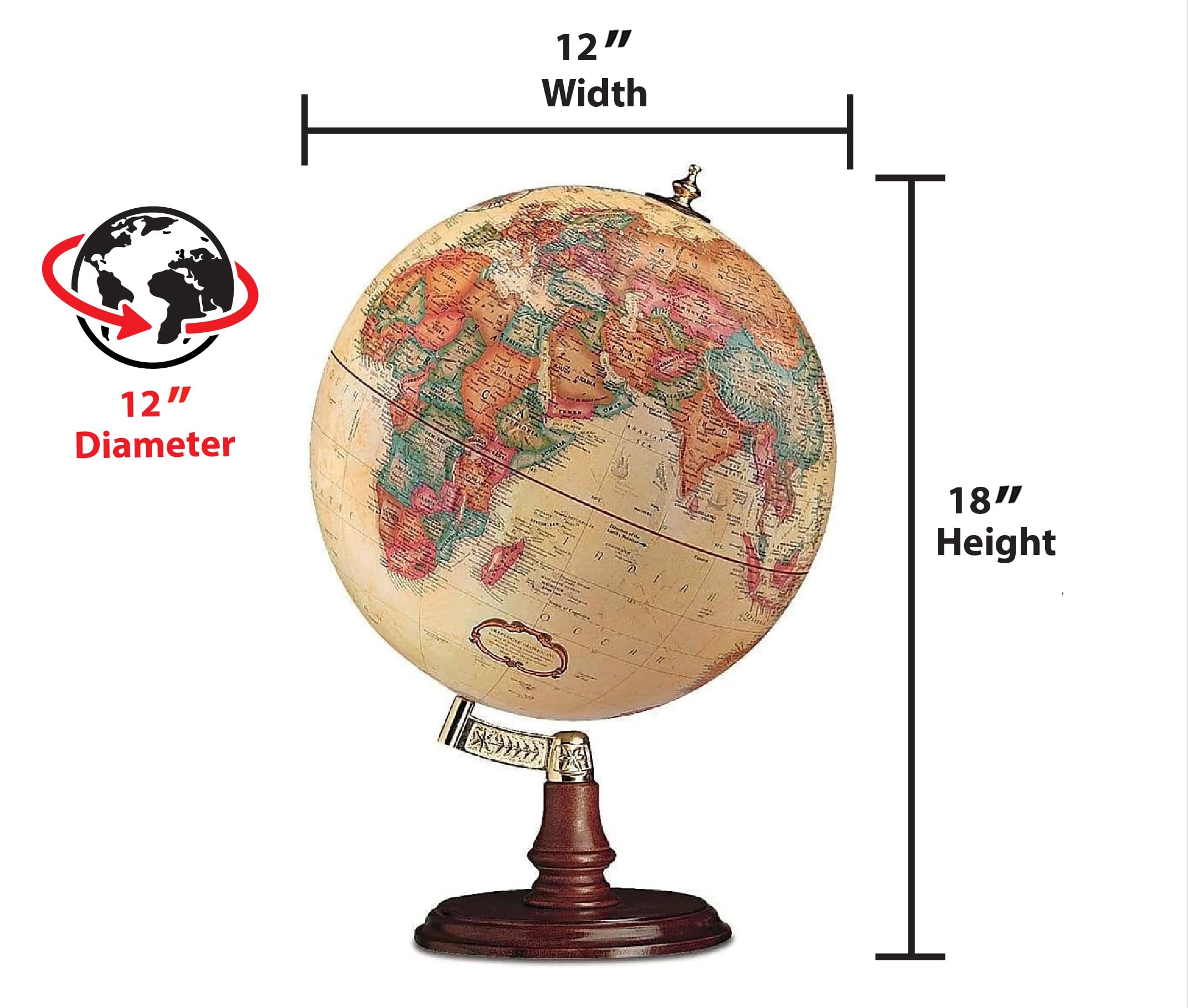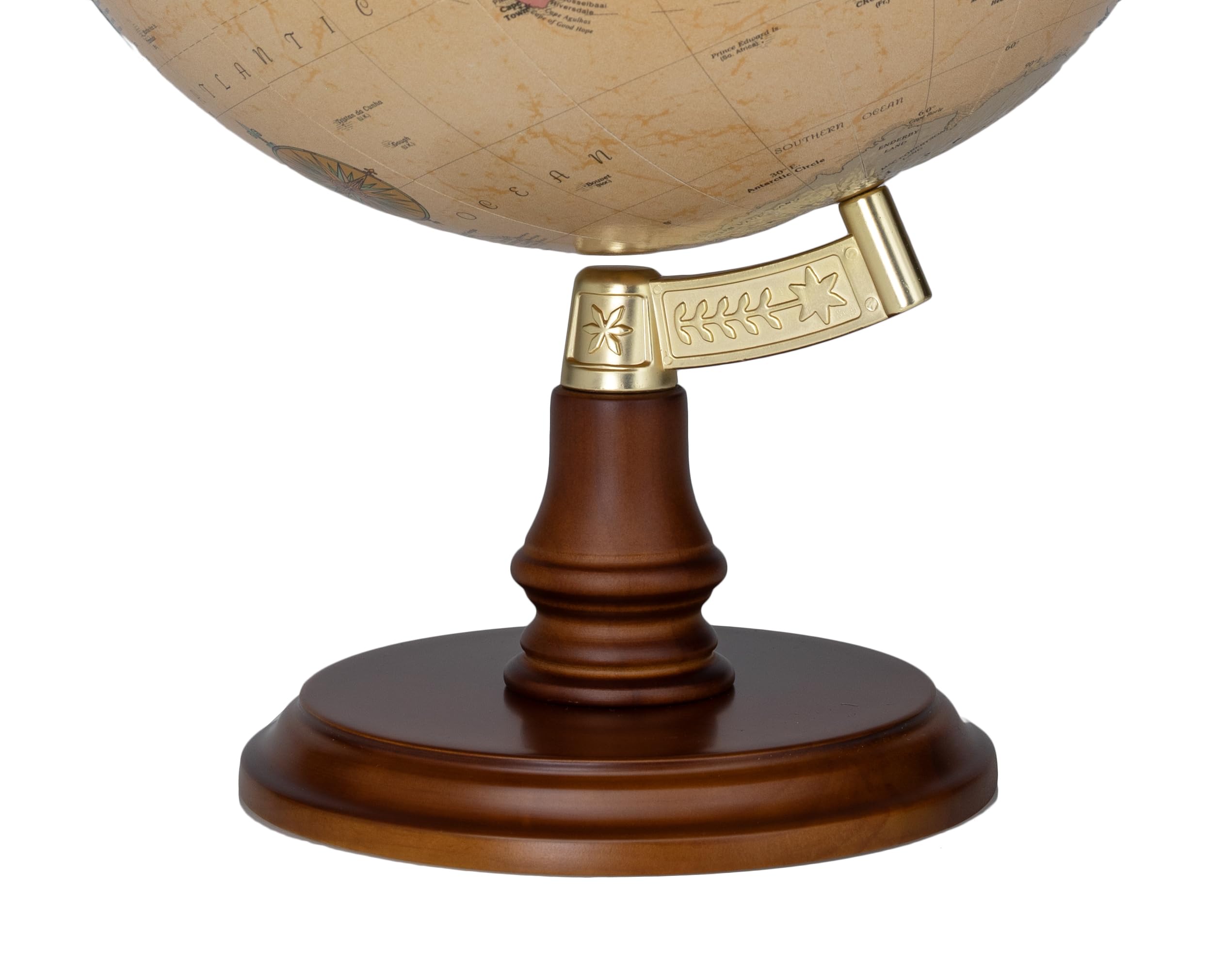 The Cranbrook desktop globe features a 12" antique ocean globe with political map stylings and raised relief mounted on a walnut finish wood stand with inclination mount. Overall size is approximately 18"h x 12"w x 12"d.