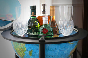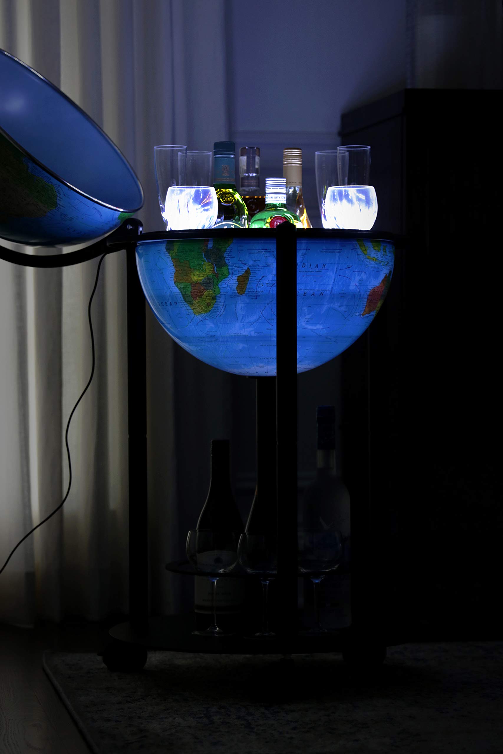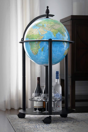 This Illuminated Bar Globe sets itself apart from other bar globes in many ways. It has an up to date topographical map on outside surface, and once illuminated, it shows up to date political map on inside surface. The globe ball also features a raised relief texture that accentuates mountainous terrain. The globe is illuminated by safe and reliable LED lights. The stand is a powder coated dark grey color that will go with any decor. When you open the northern hemisphere you will discover a spacious drink cabinet which allows you to store a diverse number of spirit bottles and glasses. The base has also designed shelf to accommodate additional storage of glasses and bottles. In addition, clean-up is easy due to the vinyl map material of the globe ball.