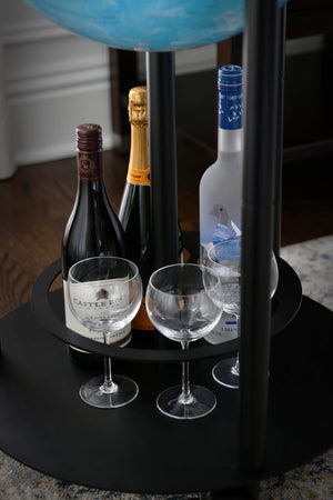 This unique bar globe includes a sturdy combination lock that can be used to secure select spirits or crystal drink-ware. You will locate 3 casters on the stand bottom that have a locking mechanism to ensure that the globe will not inadvertently roll and will stay in the exact location you want.