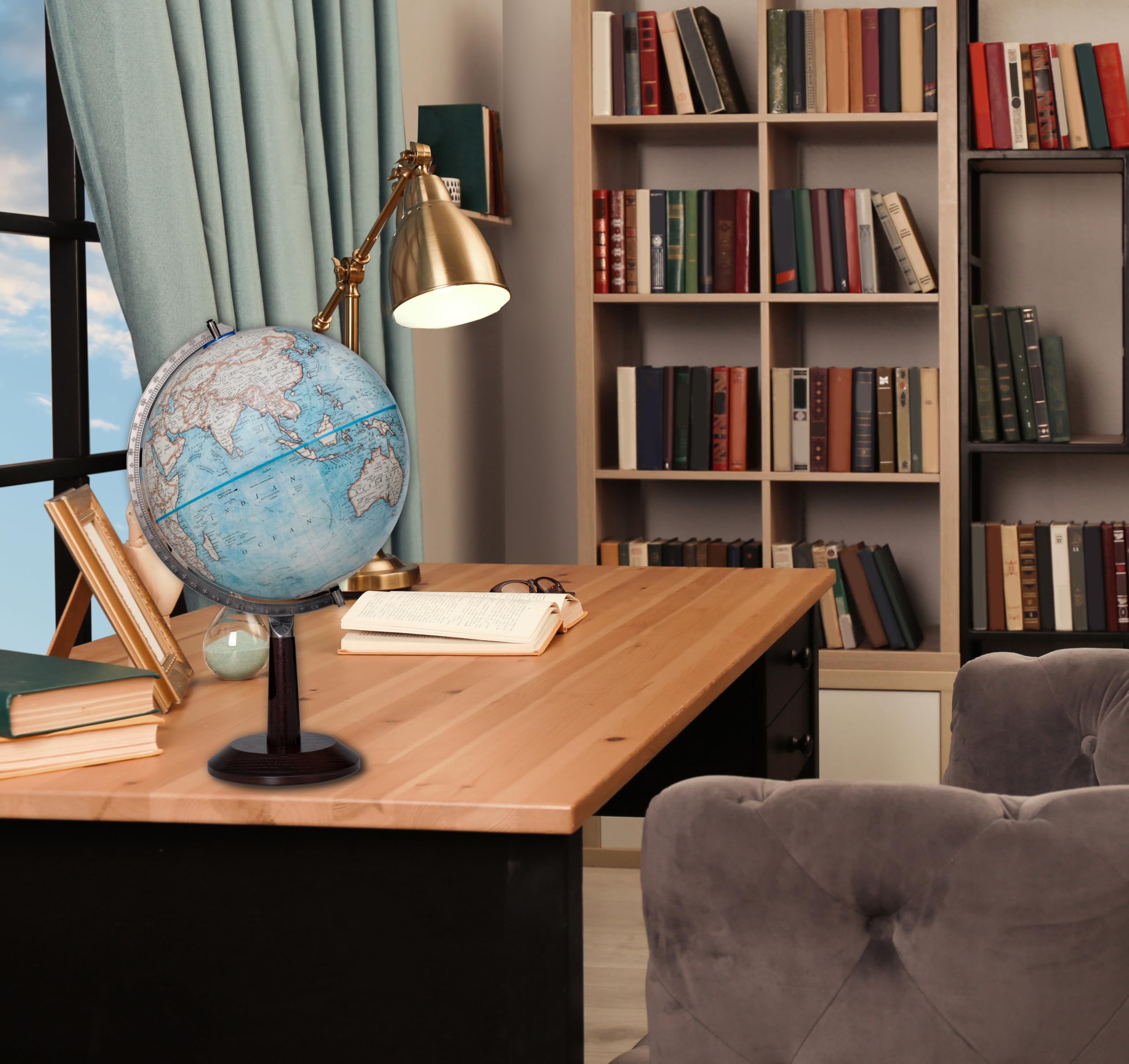 The Lincoln Blue Ocean Designer Globe is a truly special globe. Standing 21" tall this 12" diameter globe is held by a antique numbered die-cast semi-meridian. The hand stained walnut colored base and riser are made of a solid hardwood and the finishing highlights the natural grain and beauty of the wood. The globe ball features a unique parchment blue ocean with white landmasses and beautifully outlined country borders. This is the perfect gift for the person that has exquisite taste and appreciates fine craftsmanship. Manufactured in the USA