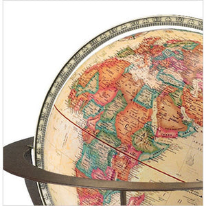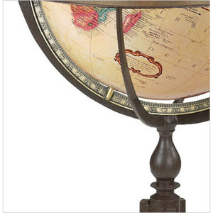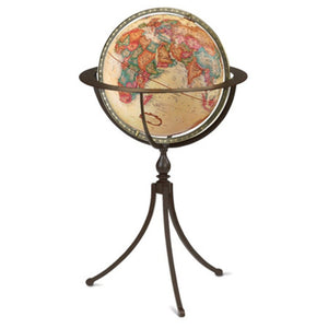 Handcrafted and worldly, this distinctive stand is fashioned from wrought iron with a rustic textured finish. A 16" globe with raised relief and an antique brass-plated meridian complete this contemporary interpretation.