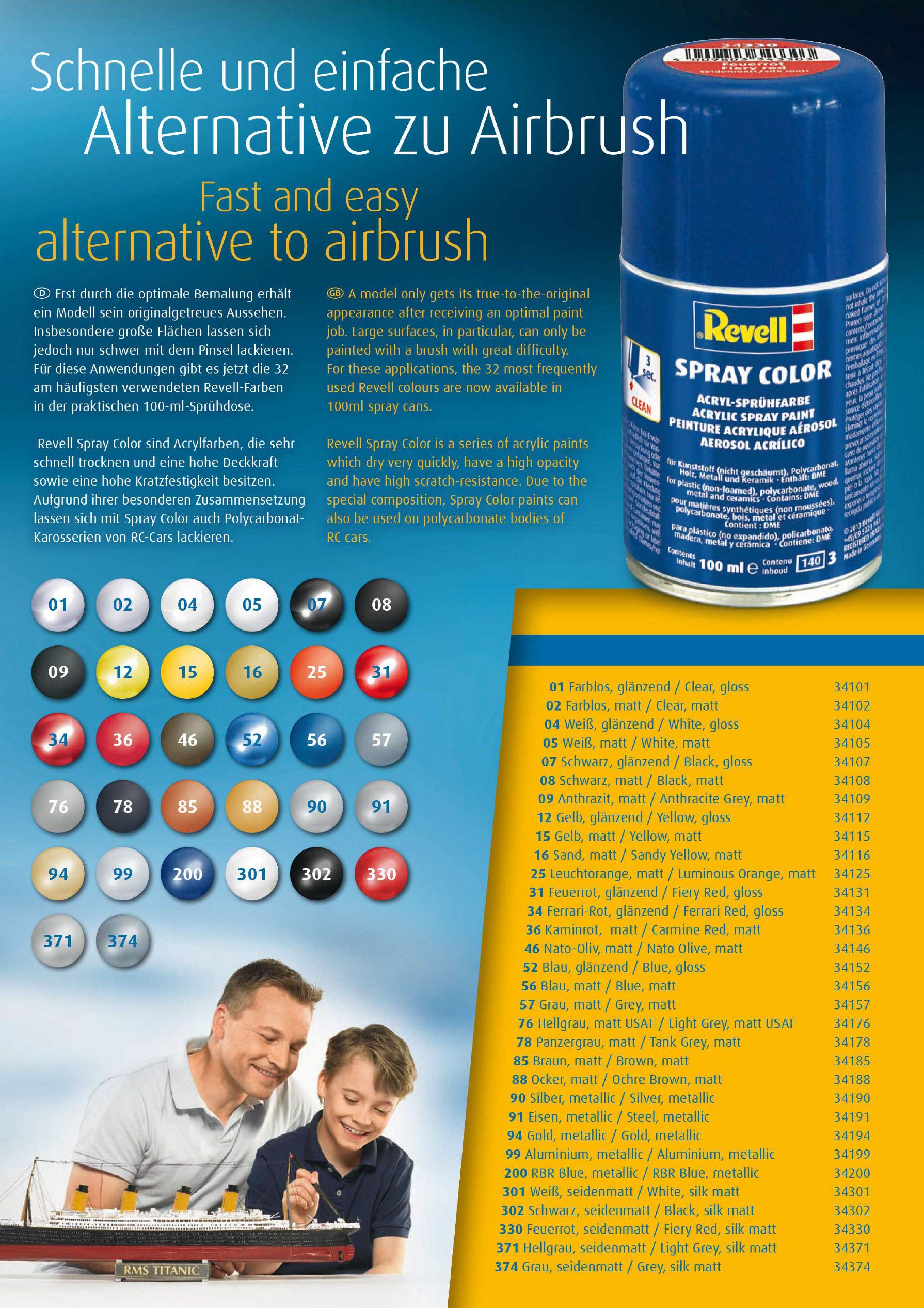 Revell Spray Color are acrylic spray paints that dry very quickly and have high opacity and high scratch resistance. Due to its special composition, the polycarbonate bodies of RC cars can also be painted with Spray Color.