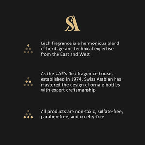 Amaali opens with juicy pineapple, crisp green apple and zesty lemon. A breathtakingly feminine bouquet of white jasmine petals and deep red roses bring the heart of the fragrance out into the moonlit air. As the petals meld into a woody sensual territory, a radiant accord of golden vanilla and silky caramel emerges, making you smell unforgettably delicious all night long. Niche perfumery is a state of mind. Its perfumes circumvent the laws imposed by marketing and fall outside of the traditional commercial channels. Artisan fragrances are not developed based on a marketing study conducted by commercial brands, but originate from the imagination and artistic sensibility of a perfumer. Enjoy our wonderfully unique, luxury personal fragrances, made with only the highest quality ingredients. At Swiss Arabian, our expertise and passion, our knowledge of legendary Arabian perfumery, oriental craftsmanship and contemporary elegance, all come together to create fragrances that capture your imagination and celebrate your true essence. The history of Swiss Arabian is an enchanting tale that spans over 40 years. This pioneer in Arabian perfumes was founded in the year 1974 by a visionary with a wealth of knowledge and a deep passion for perfumery. Today, Swiss Arabian is the first perfume manufacturer in the UAE. We operate five modern manufacturing facilities spread across an area of 165,000 sq. ft., producing more than 35 million perfumes annually and export to over 80 countries.