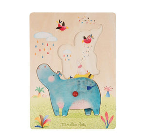 Baby's first puzzle. A lift-out puzzle illustrated with the characters fromthe range, the hippopotamus, the lion and the elephant, tight-rope walking inthe middle of the savannah. Beneath each piece of the puzzle hides a differentscene...
